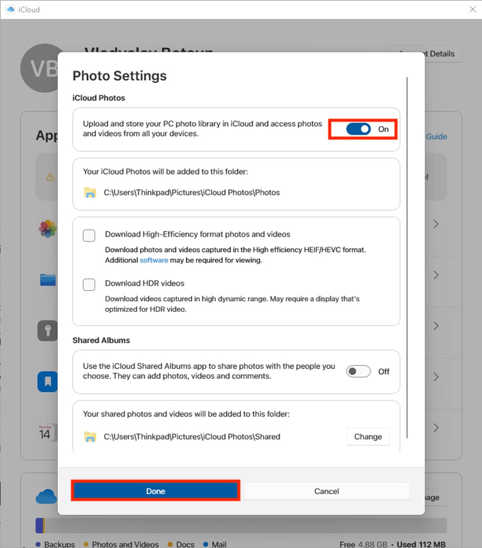 - در نوار کناری سمت راست، روی iCloud Photos کلیک کنید.